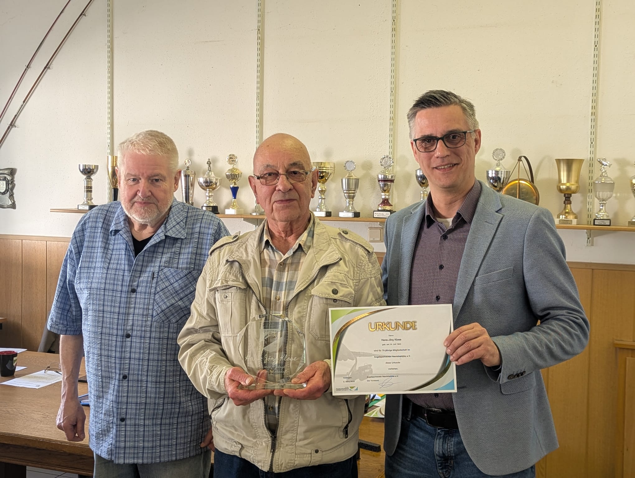In der Jahreshauptversammlung am 08.03.2026 konnte der 1. Vorsitzende Gerd Hehs (links) und der 2. Vorsitzende Jan Sowada (rechts) unser Vereinsmitglied Hans- Jörg Klose (mitte) zu seiner 70- jährigen Vereinsmitgliedschaft ehren.